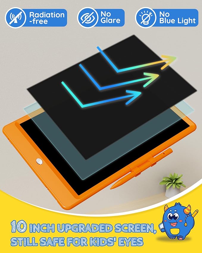 • Free Child’s Imagination: Tekfun LCD writing tablet provides 10 inches of space for kid’s writing and drawing, free children's imagination. The eye-protection colorful screen of doodle board provides a better painting experience, avoiding injury to a child’s eyes from long-term use