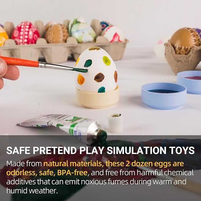 • CHILD AND ANIMAL-SAFE PRETEND PLAY SIMULATION TOYS - All materials used on these fake Easter eggs from the wood to the paint are safe and BPA-free. It's safe even for younger children. They are perfect as a part of children's kitchen toys playset or in a farm simulation playset. They'll have a blast collecting "eggs" from a "chicken coop" and storing them on egg cartons.