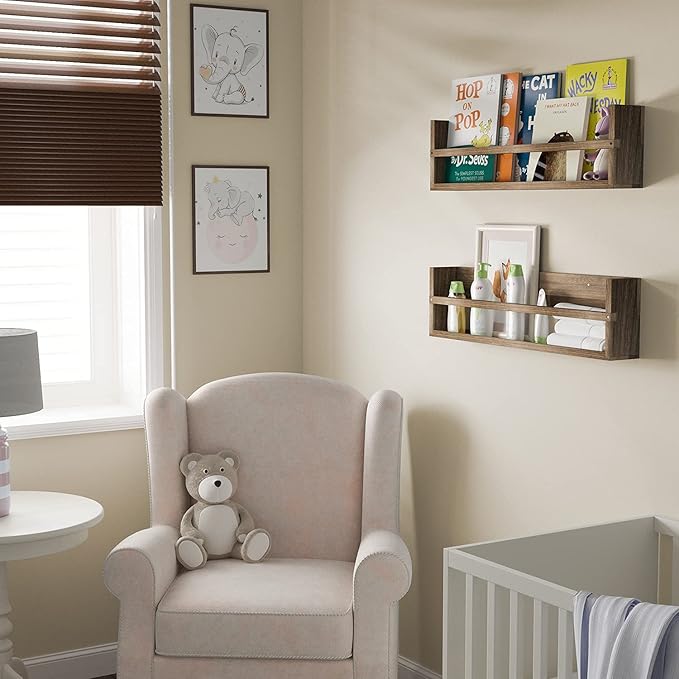 • Multiuse Shelf: Thanks to these storage shelves' wooden and simple design, you can use them not only in your kids room or nursery but also in different places. Mount them on your bathroom wall as makeup organizer or your kitchen to store spice jars and display recipe books.