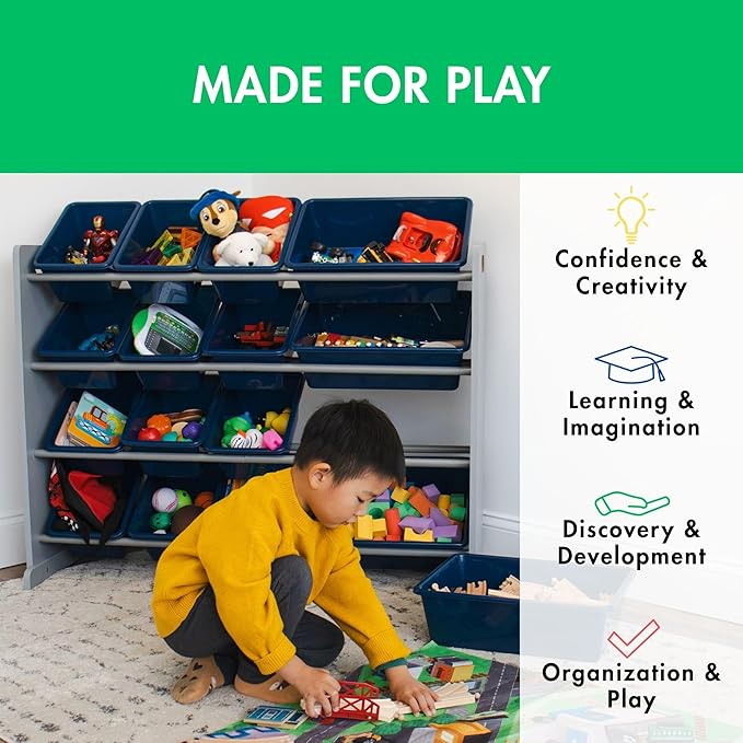 • Supersized Storage Solution: Transform clutter with this 16-bin toy organizer. With 12 standard and 4 large bins, it offers 25% more storage than standard organizers, making it perfect for large toy storage and keeping your kids' space tidy.