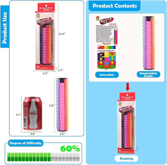 • 【 Uses 】Unlike other brain games,the patented,critically acclaimed cube puzzle is a unique toy and unique gift,it is a combination of rotating magic cube and slide puzzle,each puzzle piece can be rotated from up and down with a whole column around the axis as well as be slided left and right on a row