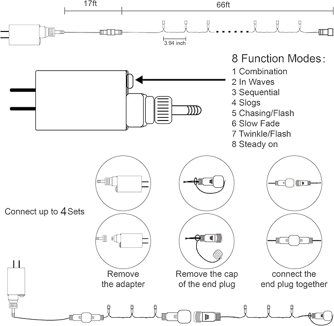 • 29V low voltage green wire string lights: Keep at a low temperature state after lighting up for hours, ensure and maximize the safety. Directly plug in and unplug it for power on and off. US standard outlet, voltage 110V. Adapter to the first LED light: 17ft. Total length(lights string and leading line): 83ft.