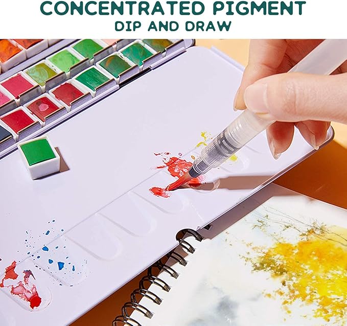 • 【Perfect Gift Choice】 This watercolor set is packaged with a metal box and includes a water-filled brush pen. A built in finger ring design makes you more convenient to carry this tin box. The half cover of this box can be used as palette. Great gift for students, watercolor lovers, professional watercolor painters, kids.Ideal for coloring books, business cards, art diaries, sketching and creating your own artwork on watercolor pad