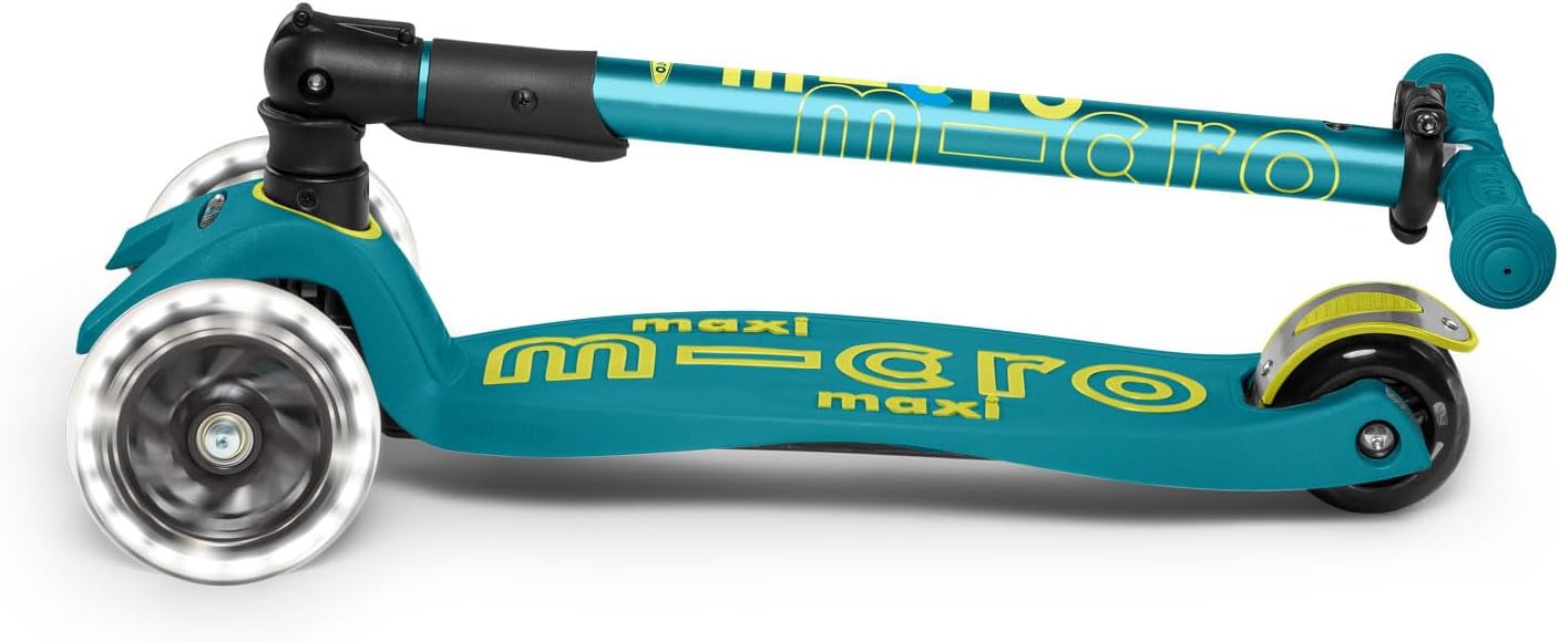 • Micro's newly upgraded Maxi Deluxe Foldable LED features motion-activated light-up front wheels and a foldable T-bar for easy carrying & travel. Created with a lean-to-steer design, offering a stable ride that supports children as they curve and carve the sidewalk.