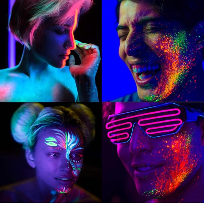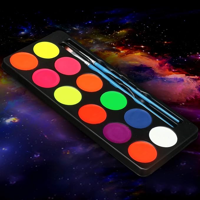 • 【12 Colors UV Set】Our face painting kit includes 12 neon glow colors UV face paint, 5 sets of painting stencils, 1 large brush for greater coverage and a vibrant finish, 1 thin brush for ultra-fine lines and sharpening the edge of. At night or under a black light, these paints will shine a stunning neon glow, making you the center of attention for any occasion! .