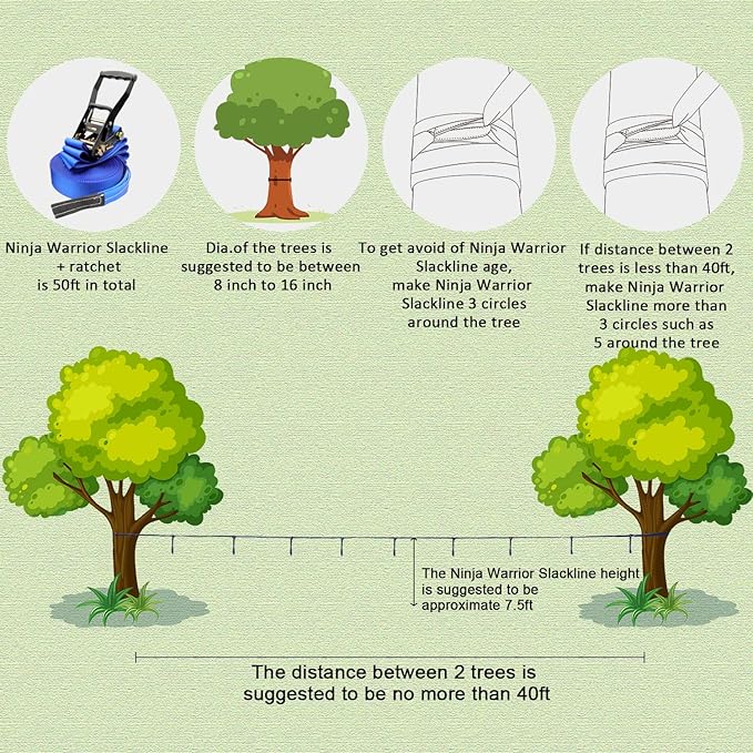 • [Upgraded Strength] - Upgraded Version Ninja Warrior Slackline. It's excellent safe ninja rope for kids outdoor play. Made of towing strap material, 150% thickness of regular slacklines, ensuring excellent firmness for long time use. Nothing is more important than that kids play in safety