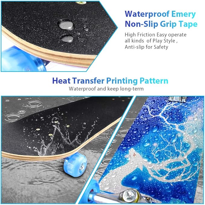 • 【STICK MATERIAL】 7-Ply 31" L x 8" W x 4" H Maple Wood make the wood deck very durable and can bear 220lbs weight , Super soft PU Wheels cut off damping when you riding , Alloy Truck provide more steady structure for skateboard, ABEC-11 Bearings make the wheels turn around more smoothly , Pattern: Heat Transfer(which was printed onto the board,not a sticker.) make the pattern durable a long time.