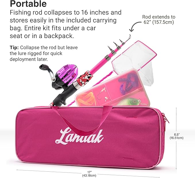 • STARTER FISHING GEAR KIT includes: 65 inch pink telescopic fishing rod, spinning reel, minnow net, beginner’s guide, fishing lures, carry case and tackle box stocked with gear.