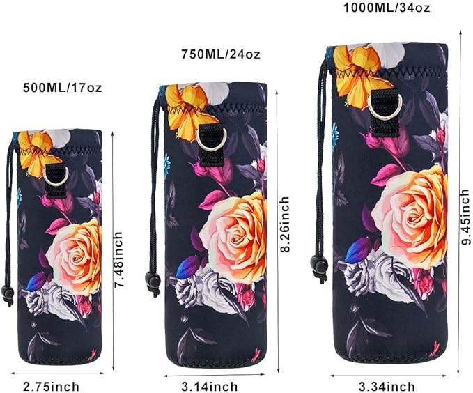 • Three Size for your choice: 500ML(16.9oz) water bottle bag,Length-7.48 inches,Diameter-2.75 inches;750ML(24oz) water bottle holder,Length-8.26 inches,Diameter-3.14 inches;1000ML(34oz) water bottle carrier,Length-9.45 inches,Diameter-3.34 inches.