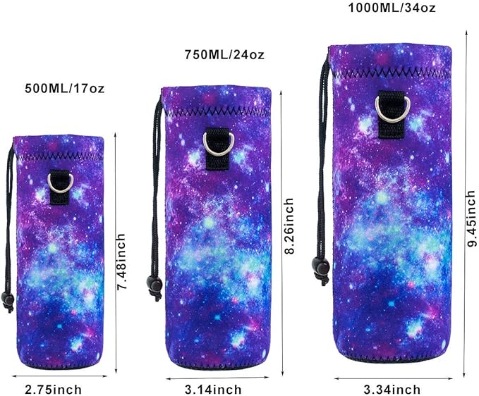 • Three Size for your choice: 500ML(16.9oz) water bottle bag,Length-7.48 inches,Diameter-2.75 inches;750ML(24oz) water bottle holder,Length-8.26 inches,Diameter-3.14 inches;1000ML(34oz) water bottle carrier,Length-9.45 inches,Diameter-3.34 inches.