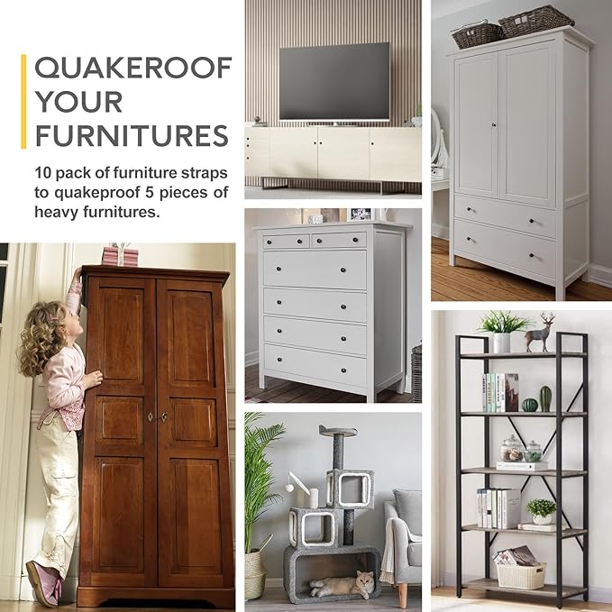 • Widely Application To Anchor Different Furniture: The anti-tip furniture straps includes all hardware including screws, adjustable straps, brackets, wall anchors. It is widely used to anchor furniture such as bookshelf, bookcase, cabinet, drawer, dresser, TV stand, armoires, wardrobes, any baby furniture and leaning mirror wall anchors. Ideal for protecting children and pets from the dumping of furniture
