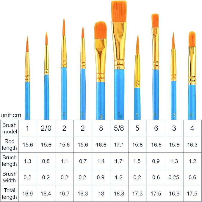 • 10 PREMIUM BRUSHES INCLUDED: 10 multi-functional brushes with different sizes, round & flat tips for detailing and broad strokes. Durable, splatter-resistant bristles for smooth application. You can use the brush to describe the details of your paintings