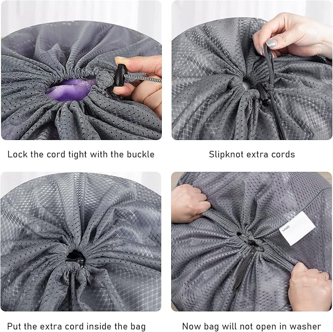 • 【Drawstring Locking Closure】The mesh bag has an locking drawstring closure to prevent spill. If you use them as wash bags, please tuck toggle inside the bag to avoid the drawstring loosen in washing machine.
