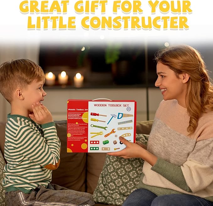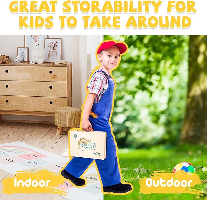 • 🛠Premium Solid Wood : Designed to last, we carefully selected first-class solid wood to make these wooden tools. They are non-sharp compared with real tools, protecting small hands from being hurt while they mimic mom and dad using tools. A nice wooden storage box with portable handle keeps all pieces organized, and makes it easy to bring to a trip.