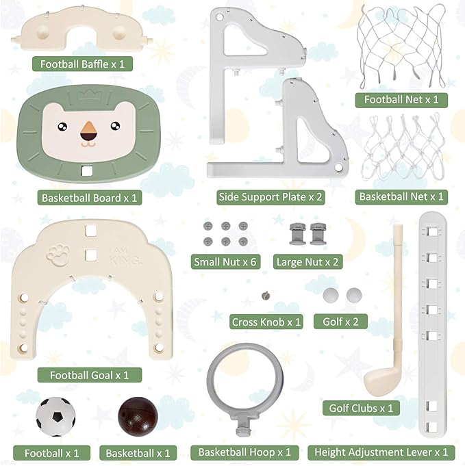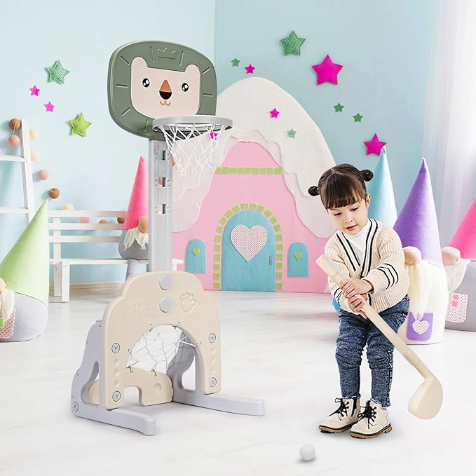 • 【3-in-1 Activity Center】 This kids basketball hoop has three sports to play, including golf game, basketball game and soccer goal game. It also comes with 1 basketball,1 soccer ball,2 golf balls and 1 golf club. By playing by themselves or with friends, children can gain unlimited joy and develop motor skills!
