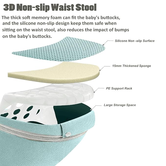 • Ergonomic Hip Seat: The waist stool maintains the baby's M-shape during carrying, helping their skeletal development. The wide waistband make the hip seat to fit snugly against the parent's waist, helping to share the weight during carrying baby. The inward sloping angle of the hip seat keeps the baby close to the parent's body comfortably and reduces bumps and shaking when parents walking. Besides, it make baby feel safety in their arms.