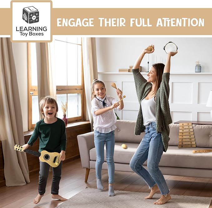 • ★【Educate Next Generation No Matter The Learning Disability】Our premium wooden musical instruments for toddlers 1-3 grades is made for every child and encourage rhythm and music sense in children of different ages. Includes: 1 Xylophone for toddlers 1-3 Set 1 Tambourine 1 Castanets 1 Egg Shaker 1 Recorder 1 Maracas and 1 Untuned Mini toddler guitar.