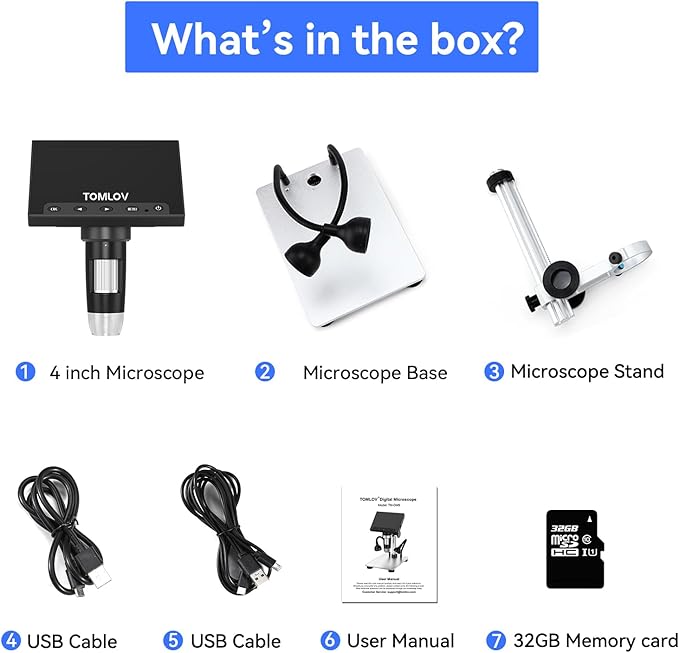 TOMLOV 1000X Coin Microscope with 4.3" Screen, Digital Microscope Magnifier with LED Lights, Metal Stand, PC View, Photo/Video, 32GB SD Card, Windows, macOS Compatible, DM4S