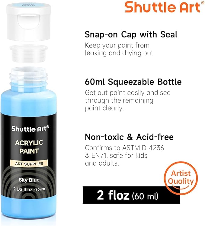 • 25 VIBRANT COLORS: Shuttle Art Acrylic Paint Set comes with 25 colors acrylic paint in 60 ml/2 oz bottles, providing the most commonly used colors and inspiring hot fluorescent and metallic colors to your art projects, ideal for painting and crafting