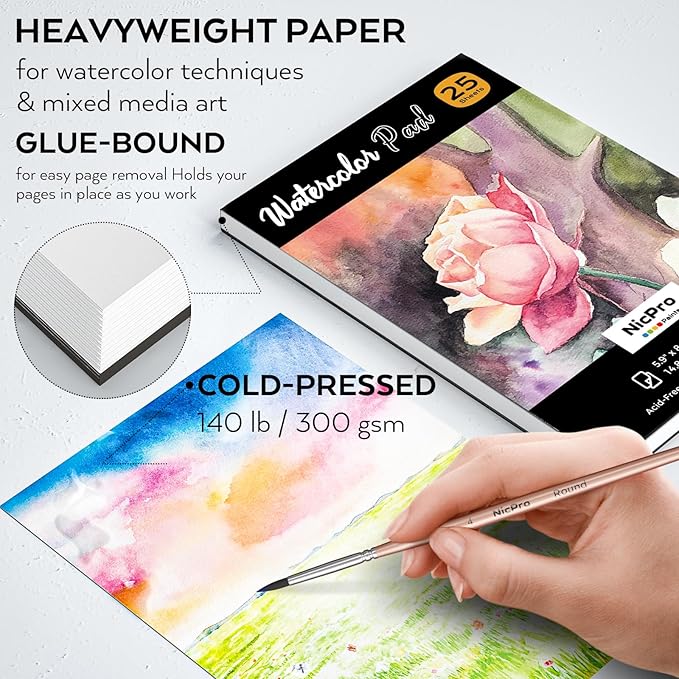 Nicpro Watercolor Paint Set, 48 Water Colors Kit with 8 Painting Brushes, Palette, Watercolor Pen, 25 Art Pad Paper, 2 Art Sponges, Non-toxic Painting Supplies for Kids, Adults, Beginners, Artists