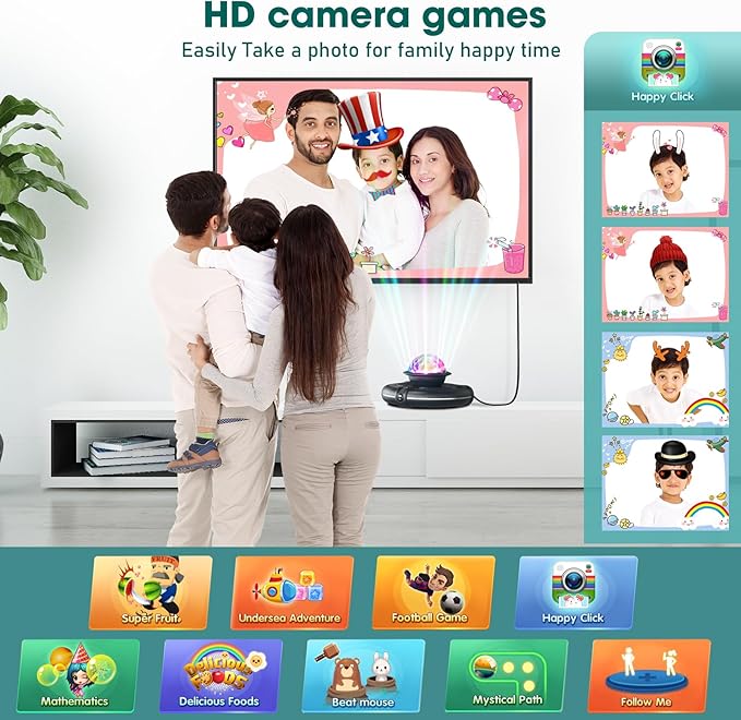 • Plug & Play Dance Party in 5 Minutes: No Wi-Fi? No problem! Simply connect via HDMI to your TV/PC/projector in ​just 5 minutes. Upgraded IC chip delivers ultra-smooth 4K visuals. The built-in 9 AR camera games, smart camera captures your every move, rendering your figure in real-time on the screen for an immersive experience. The disco ball lights create instant club vibes. Host epic kids’ birthday battles or family game nights effortlessly. Plus, two wireless controllers let you play solo or battle it out with friends!