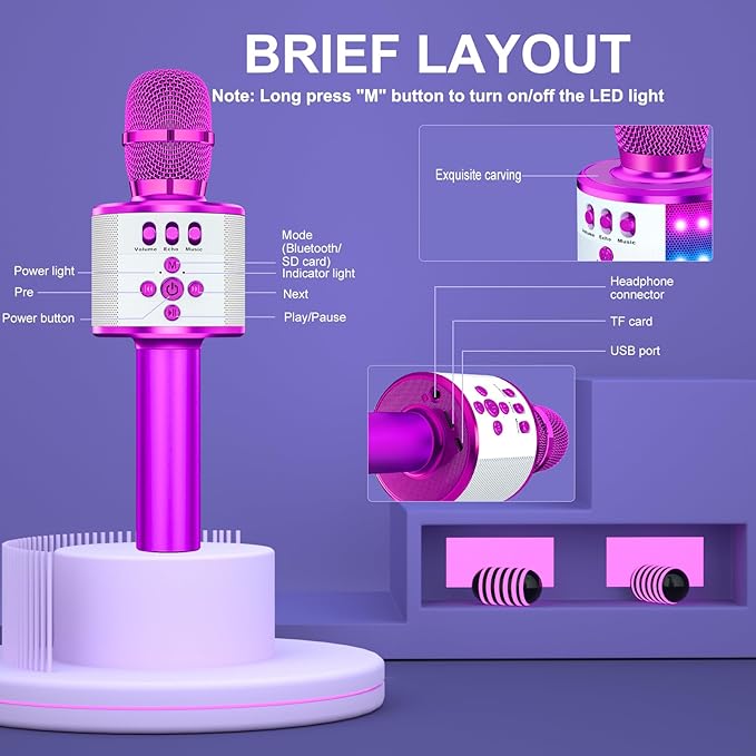 • 【Great Gift Ideas】— BONAOK microphone is a party favor for 4 5 6 7 8 9 10 11 12 years old toddlers, girls, boys, and teenagers. A great gift idea for holidays and activities(Valentine's Day, Easter, Christmas, Thanksgiving, New Year, etc).What you get(Q78 microphone,charging cable,giftable box, NO BLACK CASE for this color)
