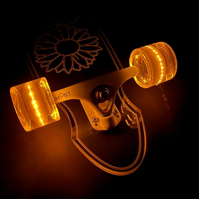 • Glow at Night: This longboard features durable light-up wheels that activate through motion, creating a visible trail during nighttime rides. With a balanced 70mm 78A construction, these ghost longboards glide smoothly on different surfaces. Its sleek build makes it ideal for those seeking clear long boards, whether for city cruising or relaxed outdoor use.