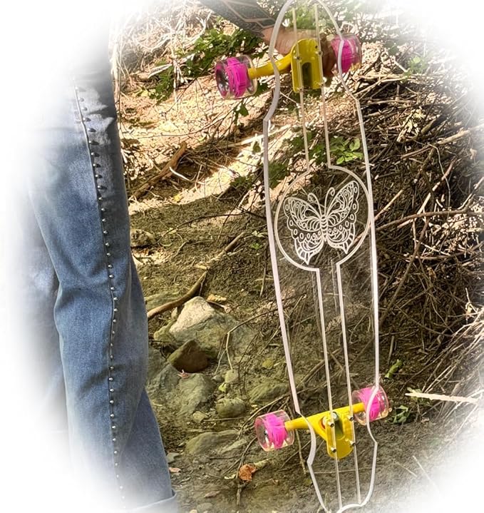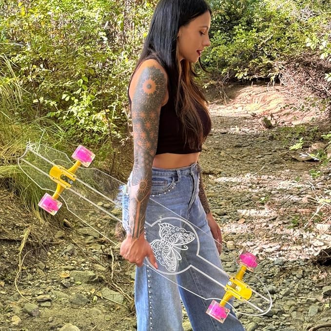 • Easy Maintenance Ride: This longboard requires minimal upkeep-simply rinse with water or polish with a board-safe cleaner to retain its clarity. Its durable body holds up well under everyday use, making it a reliable piece for both short and long sessions. Riders looking for alternative styles like clear skateboard or advanced lighting like skateboards with light-up wheels, will appreciate its long-lasting design.