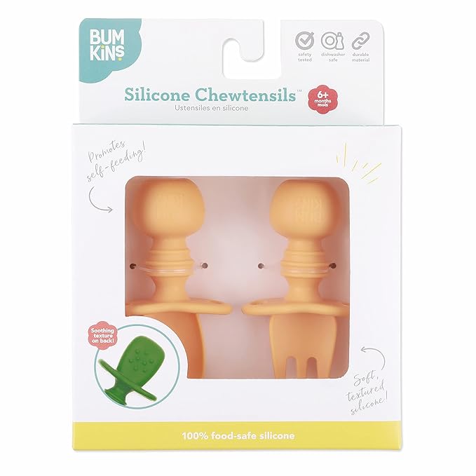 Bumkins Baby Utensils Set, Chewtensils Silicone Spoons for Dipping, Self-Feeding, Baby Led Weaning, Trainer Learning, First Stage Eating, Soft Practice Fork and Spoon, Babies 6 Months, Tangerine