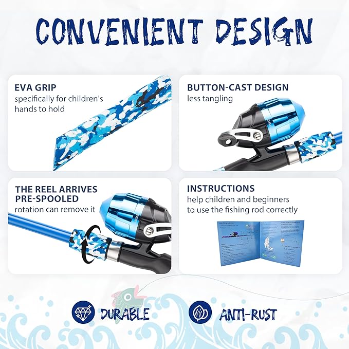 • Suitable Present for Kids - Suitable and lightweight for age 3+, designed to be simple and easy to use for them to use, the spin-cast reel is safer for them as well. A great present for Birthday, Children's Day, etc. PLEASE follow the user instruction to use. If you got any problems when using this item, please tell us for satisfactory solutions. Tips: Tighten the fishing line when retrieving the fishing rod to avoid entanglement of the fishing line