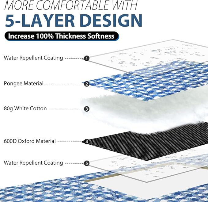• Soft and Durable with 5-Layers: Made of 3 layers, our picnic mat has thickened and sturdy fabric on the top, soft cotton for middle and solid fabric backing. Perfectly suitable for siting or lying on grass, beach, floor or any kindly of surface, giving you soft and comfortable feelings