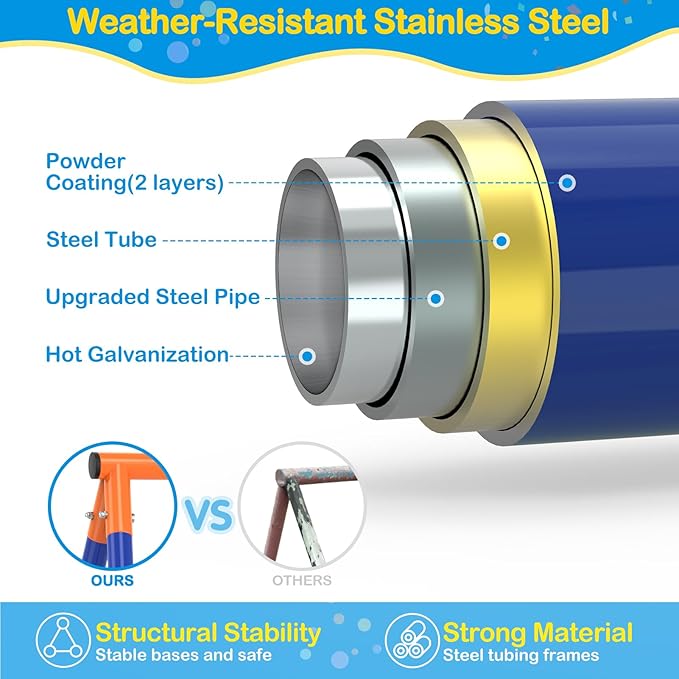 • Safety First: The strong steel construction of the metal swing set range creates a sturdy outdoor playset, thanks to its powder coated weather resistant steel poles with a diameter of 2 inches, A-frame design, holding up to 440 lbs