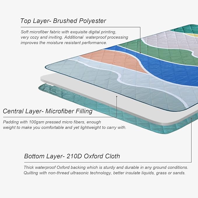 • Premium Three Layers Design: Crafted with soft brushed fabric on top, thick microfiber padding, and 210D Oxford backing. Both sides feature a waterproof coating, while ultrasonic quilting improves moisture resistance and insulation from grass or sand