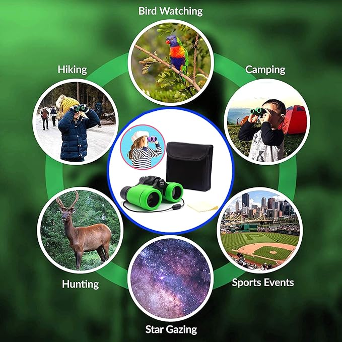 • Best Gift for Kids : Designed for kids binoculars,soft-rubber eyepiece protect the eys, so kids won't hurt their eyes.The compact kids binoculars can be folded to match eye to eye Distance Of Child.Great for bird watching, learning, hunting, theater, boat rides, hiking, traveling, and enjoying the wilderness! Explore the world with your kids!Perfect For The Children's Toy Or Educational Gifts