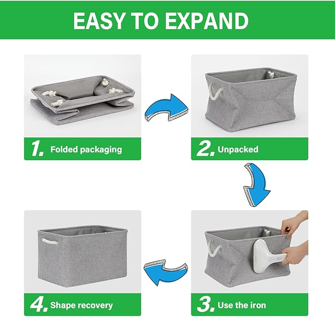 • Collapsible Baskets Set: Simply fold the canvas basket down flat for space-saving storage when not in use or when needing to transport. We shipped them in a folded package, if it doesn't stand up very well when you receive it, you can fill the large basket with clothes or blankets, it will recover gradually. If you want the basket to stand up quickly, you can use an iron to iron out the creases