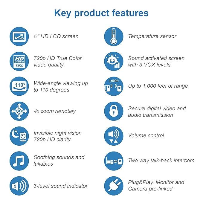 • See the Tiniest Details in the 720p HD Display - Clearly see your baby's every little move on the 5" large display in 720p High Definition. Enjoy sharp, True-Color video during daylight, and ultra bright, no-glare night vision during baby's nap hours. With the built-in 110-degree wide-angle lens, you can check in on your little one as well as the entire nursery effortlessly.