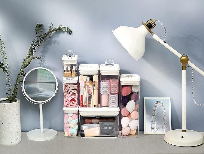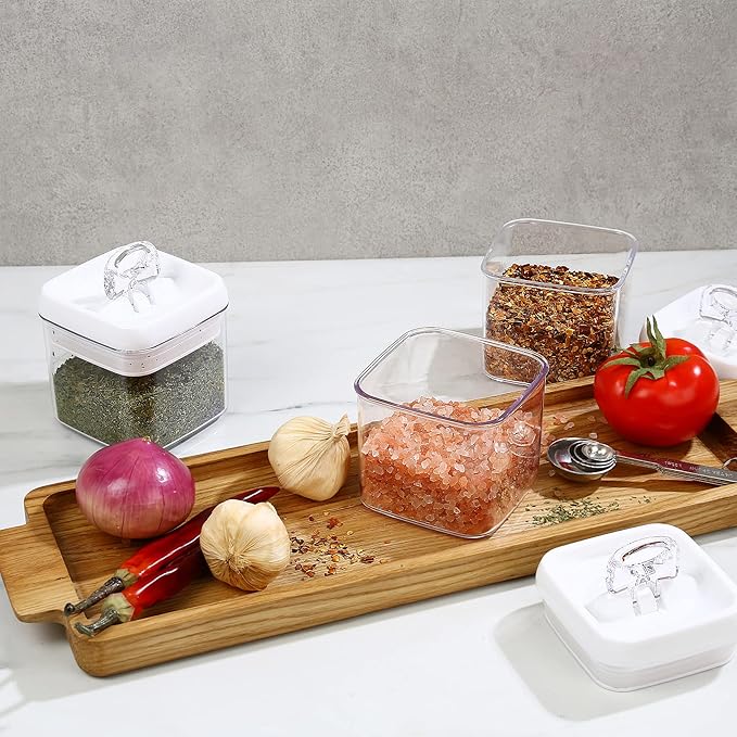 • STACKABLE & SPACE SAVING: Containers are designed to be stacked firmly on top of each other to save space in your pantry, fridge, desk, room, kitchen countertop, cupboard, and cabinet shelves. Our Regular sized containers can be stacked firmly with Rectangular sized containers to help you max out space efficiency.