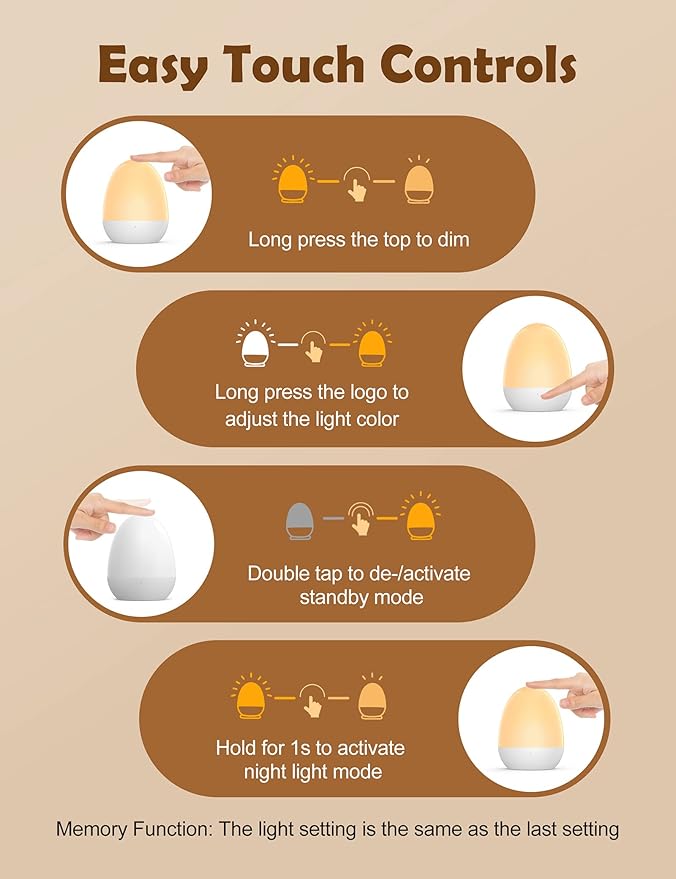 • Easy & fun Touch control: touch The top for 0.5 seconds to enter night light mode for breastfeeding at night; tap the logo twice to set a 1 hour timer to comfort your toddler to sleep