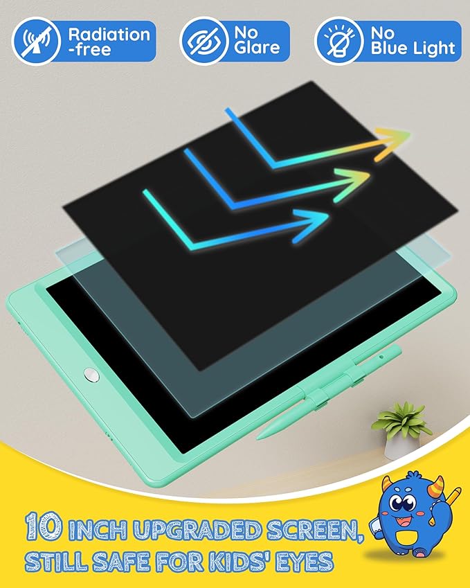 • Free Child’s Imagination: The LCD writing tablet for kids provides 10 inches of space for kid’s writing and drawing, free children's imagination. The eye-protection colorful screen of doodle board provides a better painting experience, avoiding injury to a child’s eyes from long-term use