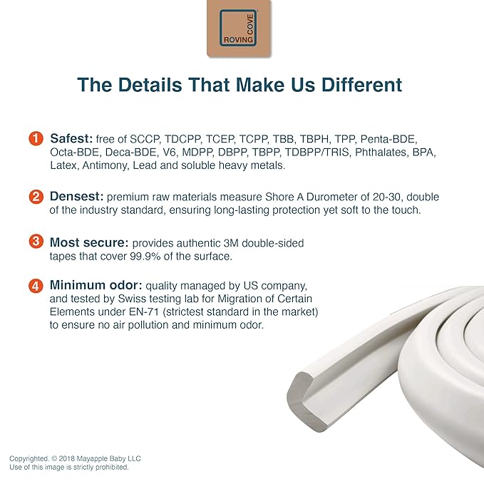 • CLEAN SAFETY: Roving Cove uses safe and pure raw material and was the first brand to make foam safety bumpers without the use of toxic flame-retardant chemicals (SCCPs). Our edge protector cushion contains no BPA, no phthalates, no heavy metals, no latex, no SCCPs. Inherently flame-resistant; passed flammability tests under US regulations.