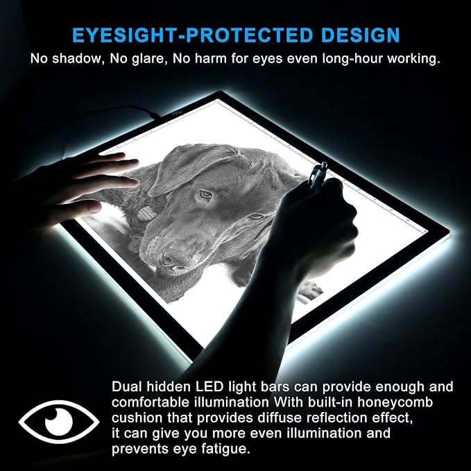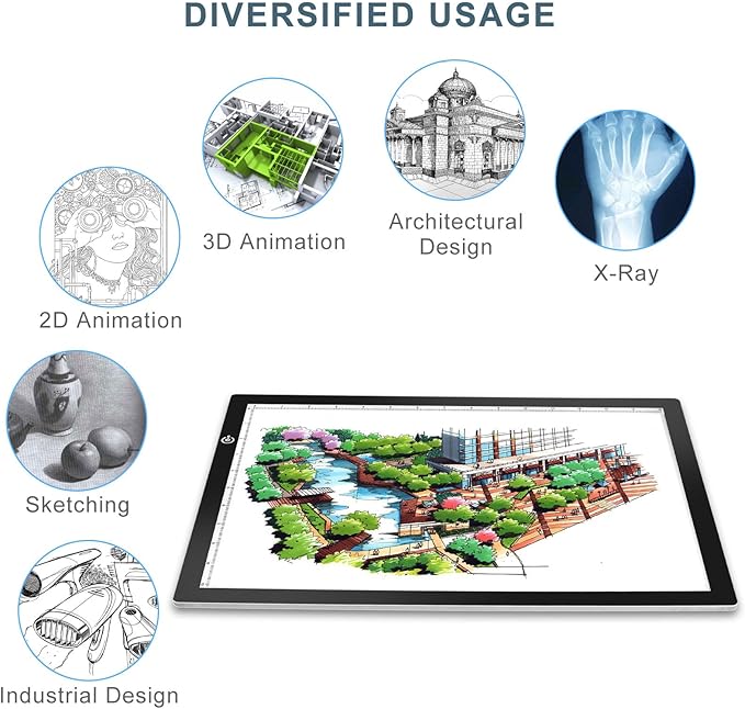 • NO SHADOW, NO GLARE, PROTECT EYES. The light pad providing ideal working lighting environment for penmanship and design. Providing the most comfortable lighting environment for animators, designers, art enthusiasts. children and reader.