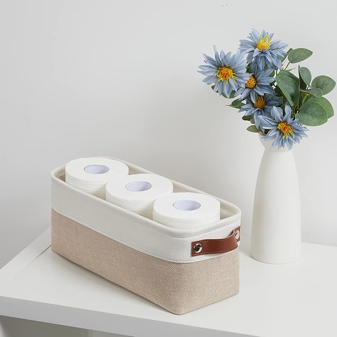 • 【Unique Design & Modern & Decorative】Set of 2 small toilet paper baskets, dimensions(each): 15(L) x 6(W) x 5.5(H) inches. Fabric storage baskets bring you organizing convenience and a sweet home. Great for socks, underwear, books, magazines, toys, pet products, wipes, towels, decorations, office supplies, DVDs, and gifts. The fabric baskets with neutral colors can match a lot of home styles - keeping your home nice and tidy.