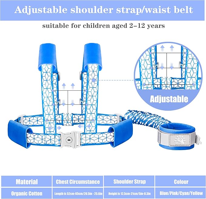 • Peace Of Mind:The child safety wristband will give you peace of mind by keeping toddlers close while still allowing them a bit of independence. The shrinking chain can extend up to 2m/6.5ft, Children's locks can prevent some troubles caused by children's self-opening in crowds,using this safety harness leash, no more worrying about your child running off.