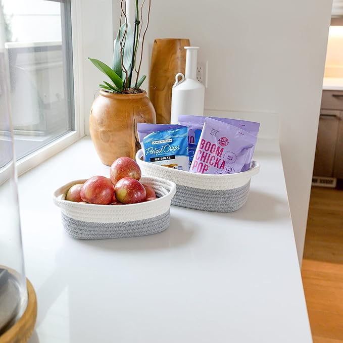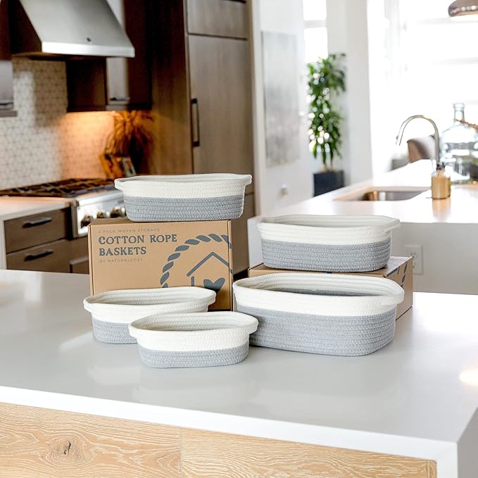 • 5 BASKETS FOR 5X THE ORGANIZING POWER: Life is messy...but your house doesn’t have to be! With 5 beautiful rope baskets for organizing, you’ll defeat messy rooms like a true supermom! Use the largest baskets for Montessori displays or countertop fruits holder, create the cutest dog toy storage or bathroom hand towel holder with the medium ones and stash jewelry or keys in the smallest. Biggest (11.8"x8.7"x4.3"), (11"x7.9"x3.9"), (10.2"x7.1"x3.5"), (9.1"x6.3"x3.1"), Smallest (7.9x5.5"x2.8")