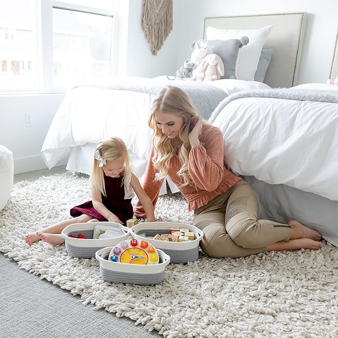 • DOUBLE REINFORCED & SCRATCH-FREE DESIGN: When you’re a full-time mom or dad, you need a storage solution that works just as hard as you do. With reinforced stitching on the handles and base, our woven storage basket set is ready to tackle some heavy-duty actions and will sustain the roughest toddler play. With our soft yet firm handwoven rope basket designs, you’ll never have to worry about scratches or marks being left on your coffee table, shelf, front door table, nightstand or any tabletop.