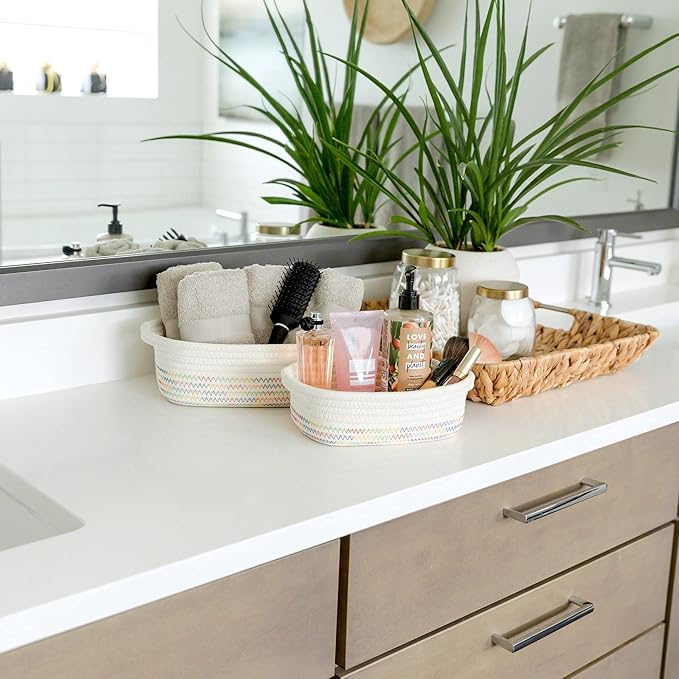 • 5 BASKETS FOR 5X THE ORGANIZING POWER: Life is messy...but your house doesn’t have to be! With 5 beautiful rope baskets for organizing, you’ll defeat messy rooms like a true supermom! Use the largest baskets for Montessori displays or countertop fruits holder, create the cutest dog toy storage or bathroom hand towel holder with the medium ones and stash jewelry or keys in the smallest. Biggest (11.8"x8.7"x4.3"), (11"x7.9"x3.9"), (10.2"x7.1"x3.5"), (9.1"x6.3"x3.1"), Smallest (7.9x5.5"x2.8")