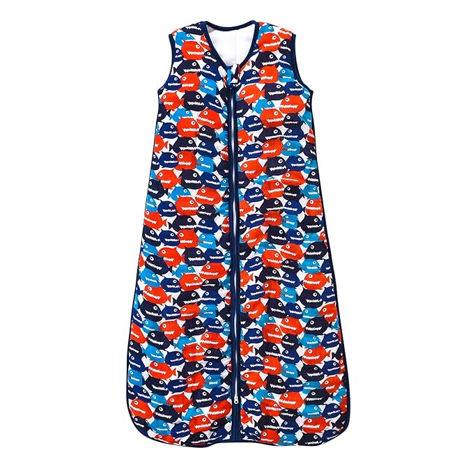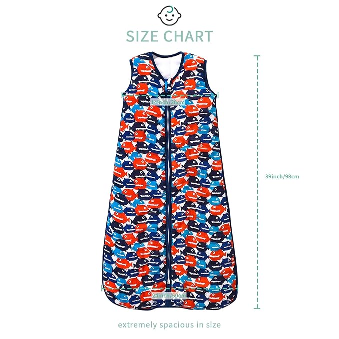 • Size and Patterns: The sleeping bag is 39" long and suitable for 2-4T toddlers. Please refer to the size chart for more information. For both boys and girls, we offer three patterns to choose from: rhinoceros, cars, and small fish. Suitable warmth for your baby in room temperature between 61℉-68℉.