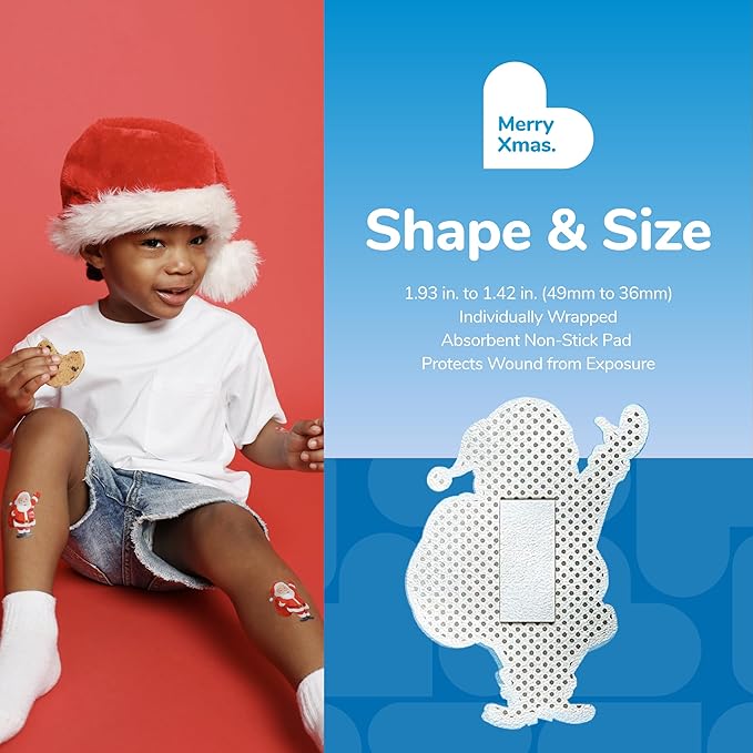 • SANTA CLAUS BANDAGES: This 24 piece pack of adorable Santa Claus bandages is great for putting a smile on kids' faces while protecting wounds such as cuts, scrapes, and burns; sticky bandages are perfect for kids and adults alike, and also for school nurses and pediatric doctors