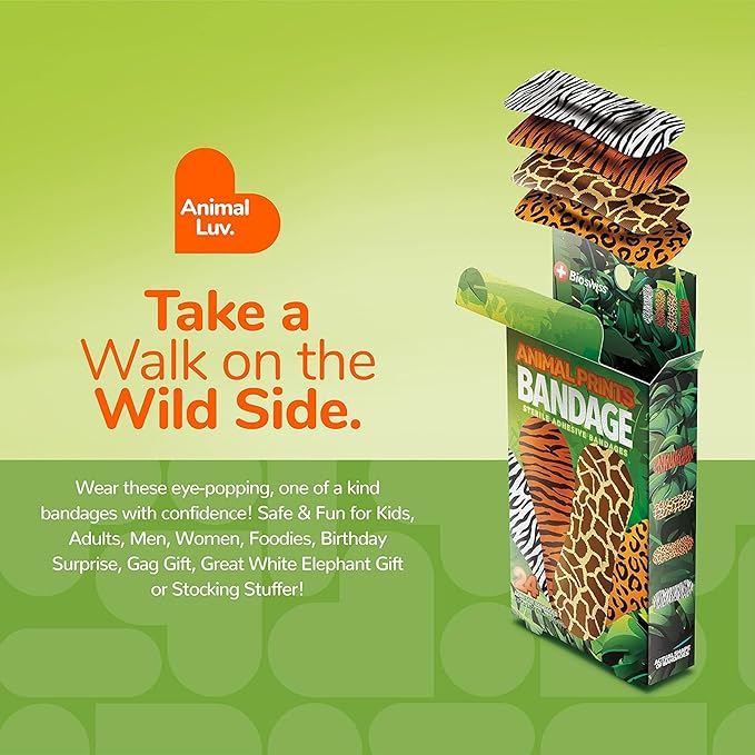 BioSwiss Bandages, Animal Prints Self Adhesive Bandage, Leopard, Zebra, Giraffe, and Tiger Print Designs, Latex Free Sterile Wound Care, Standard Shape for Kids and Adults, 24 Count