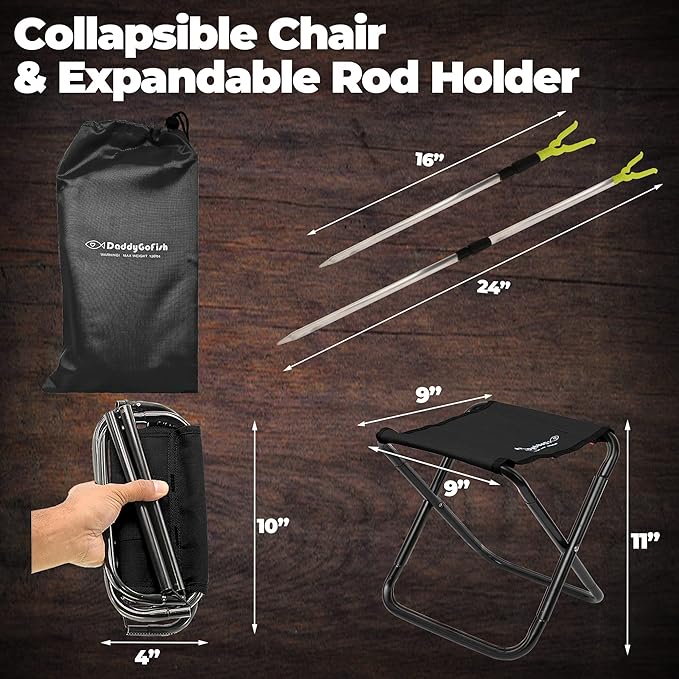 • COLLAPSIBLE CHAIR AND ROD HOLDER - Kids have a place to rest wherever they go. The rod holder keeps the fishing pole off the ground and minimizes the chance of accidental damage.